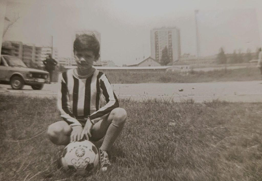 Fotka iznad i snimljena je negdje u to vrijeme. Stadion “Vojvodina” je u pozadini. Slika je crno-bijela, ali je dres plavo-bijeli. “Pošto je moja majka bila daktilograf, učiteljica iz osnovne je zamoli da joj nešto otkuca, neki rad. Pošto mama nije htela da joj ništa naplati, učiteljica da se oduži, pita mene sa čim da me počasti. Ja je povedem u sportsku radnju ‘Sport’ u centru grada i ona mi kupi plavo-beli dres i šal. Kasnije, kada se dres iscepao, isekao sam leđa i to je bila prva moja ‘Željina’ zastava“, piše mi u pripremi ovog teksta taj dječak.